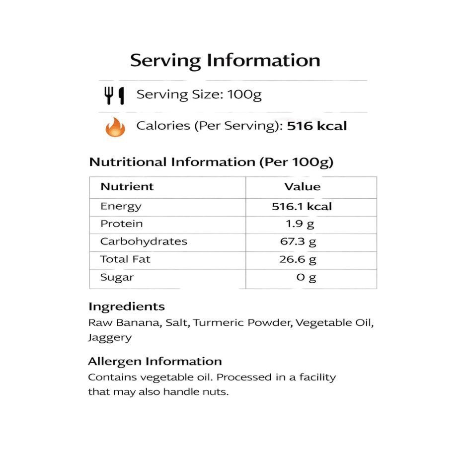Raw Banana, Salt, Turmeric Powder, Vegetable Oil, Jaggery